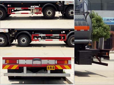 | 其他 | 該車適用于危險品運輸。類項號:8;罐體有效容積:13.8立方米,可選裝襯塑工藝;罐體外形尺寸(長×直徑)(mm):6600XΦ1750(襯塑時);罐體外形尺寸(長×直徑)(mm):6600XΦ1700(不襯塑時)。防護材料:Q23碳鋼,連接方式:左右側面及后下部防護均采用焊接連接,后部防護斷面尺寸(mm):120×50,后部防護離地高度(mm):450。僅采用底盤子午線輪胎和帶ABS的底盤; 該車前輪安裝盤式制動器,前置排氣管,裝配限速裝置,限速80km/h。安裝帶有衛(wèi)星定位功能的行駛記錄儀。ABS系統(tǒng)生產廠家:東風電子科技股份有限公司,東風電子科技股份有限公司汽車制動系統(tǒng)公司,型號:3550X-1010,DETC-ABS-4S/4M。整車長/前懸/軸距/后懸(mm)對應關系為:9650/1460/1850+4150/2190。發(fā)動機油耗對應關系(L/100km):37.2(YC6J220-50)。危險貨物運輸車輛的類型(AT型車輛)。 | ||
