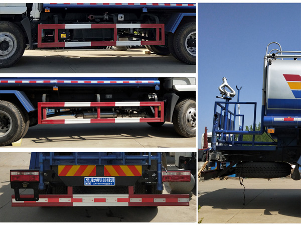 | 其他 | 罐體有效容積:9.66立方米,罐體尺寸(長×長軸×短軸)為(mm):4800×2150×1380。側(cè)防護及后下部防護裝置均采用Q235B材質(zhì),均采用焊接連接, 后部防護斷面尺寸(mm):150×50,后部防護離地高度(mm):480。ABS系統(tǒng)控制器型號/生產(chǎn)企業(yè):VIE ABS-II/浙江萬安科技股份有限公司,CM4XL-4S/4M/廣州科密汽車電子控制技術(shù)股份有限公司,安裝具有衛(wèi)星定位功能的行駛記錄儀。專用裝置:罐體,主要用于路面灑水及園林綠化。 | ||