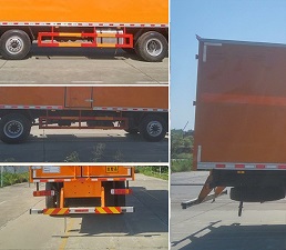 | 其他 | 該車用于運輸危險廢物,廂體頂部封閉,不可開啟.隨底盤選裝駕駛室。 該車主要用于運輸具有獨立容器(瓶)包裝的含銅廢物,含鎳廢物,含鉛廢物,含鉻廢物,廢棄電池以及《國家危險廢物名錄》中危險廢物,類項號:9.危險廢物編號: HW21,HW22, HW26,HW31,HW46,HW49。僅選用前盤式制動器,前置排氣管,子午線輪胎,限速裝置的底盤,限速80km/h,該車安裝具有衛(wèi)星定位功能的行駛記錄儀。側(cè),后防護裝置材料材質(zhì)為碳鋼/Q23;側(cè)防護與車輛采用焊接連接;后防護與車輛采用螺栓連接。后部防護斷面尺寸(mm):100×50,離地高度:500 mm。發(fā)動機ISD245 50,ISD210 50分別對應(yīng)的油耗值為:37.37,37.36.ABS系統(tǒng)的生產(chǎn)企業(yè):東風(fēng)電子科技股份有限公司;ABS系統(tǒng)型號:ABS/ASR-24V-4S/4M(控制器型號:3550X-1010)。 | ||